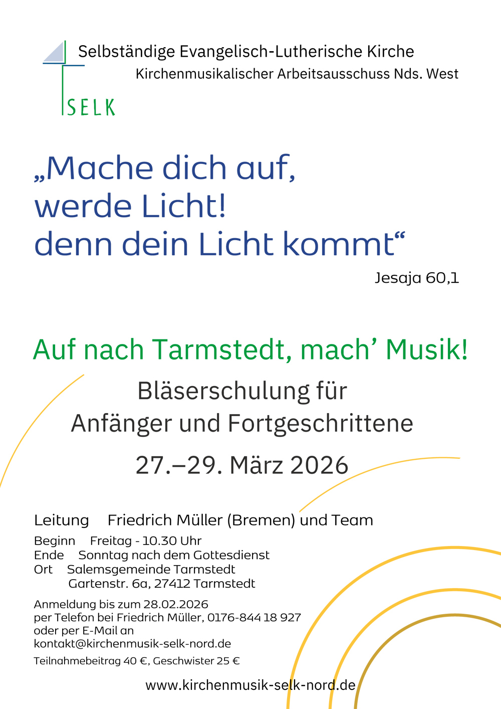Vom 27. bis 29. März findet in der Salemsgemeinde Tarmstedt eine Bläserschulung statt. Der Kirchenmusikalische Arbeitsausschuss Nds. West (KAB) lädt dazu ein. Sie findet unter der Leitung von Friedrich Müller (Bremen) statt. Friedrich Müller ist Hornist bei den Bremer Philharmonikern. Ein starkes Team wirkt mit ihm zusammen und freut sich auf alle, die dabei sind. Anfänger und Fortgeschrittene jeden Alters sind willkommen. „Mache dich auf, werde Licht! Denn dein Licht kommt“ unter diesem Motto wird in Tarmstedt Musik gemacht, Neues entdeckt, Bekanntes gestärkt. Als Teilnahmebeitrag werden 40 € erbeten und 25 € für Geschwisterkinder. Die Anmeldung ist ab sofort bis zum 12. März möglich per Telefon bei Friedrich Müller, 0176-84418927 oder per Mail an: